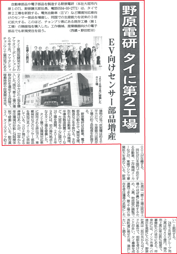 2024年6月24日付の中部経済新聞にて、NOHARA DENKEN(THAILAND)CO.,LTDの第2工場新設に関する記事が紹介されました。
